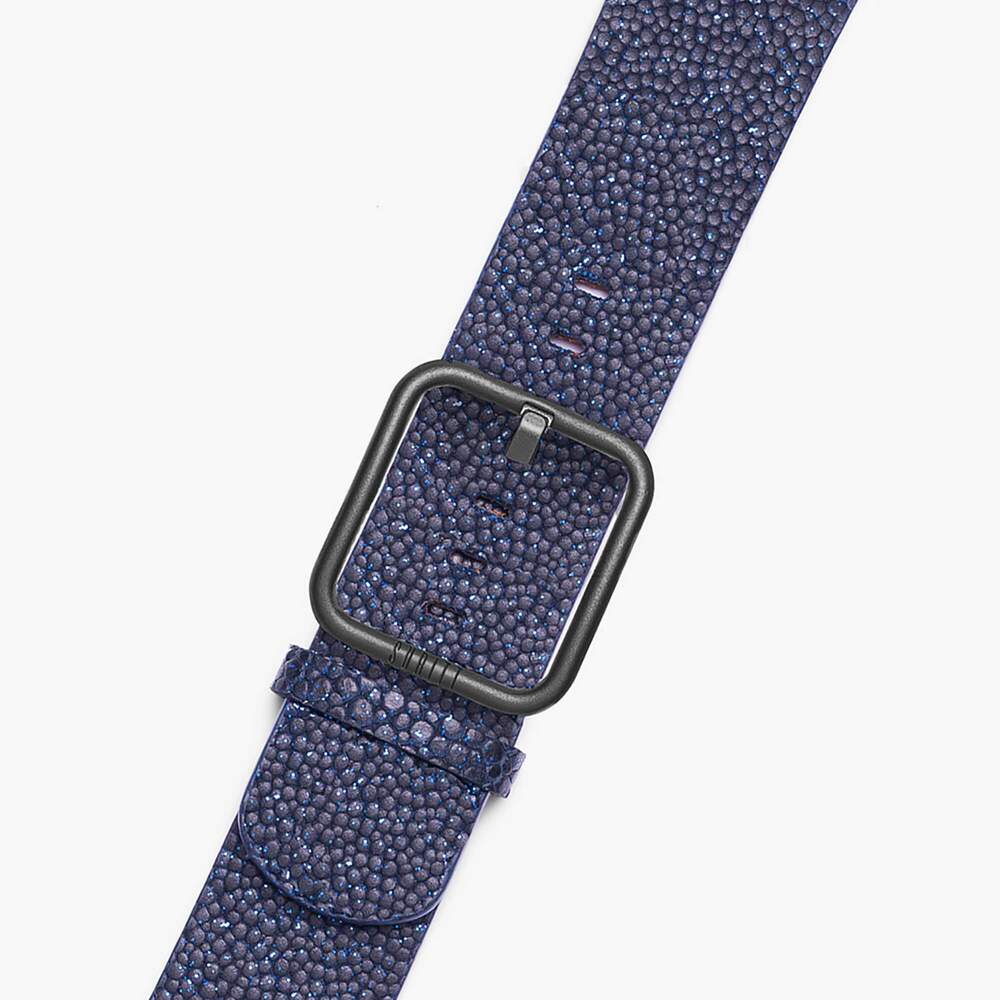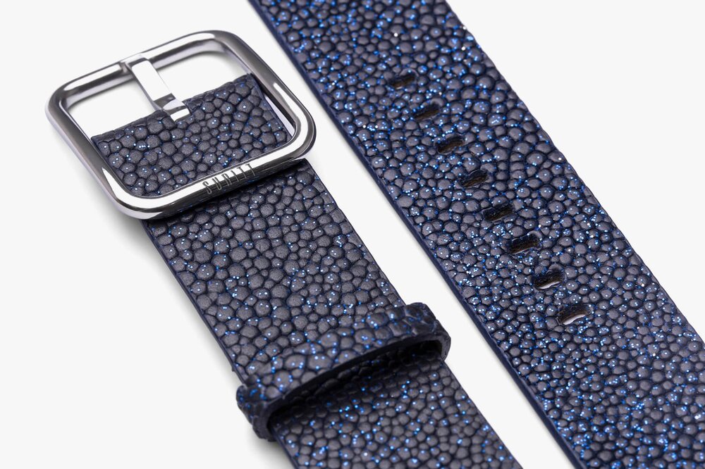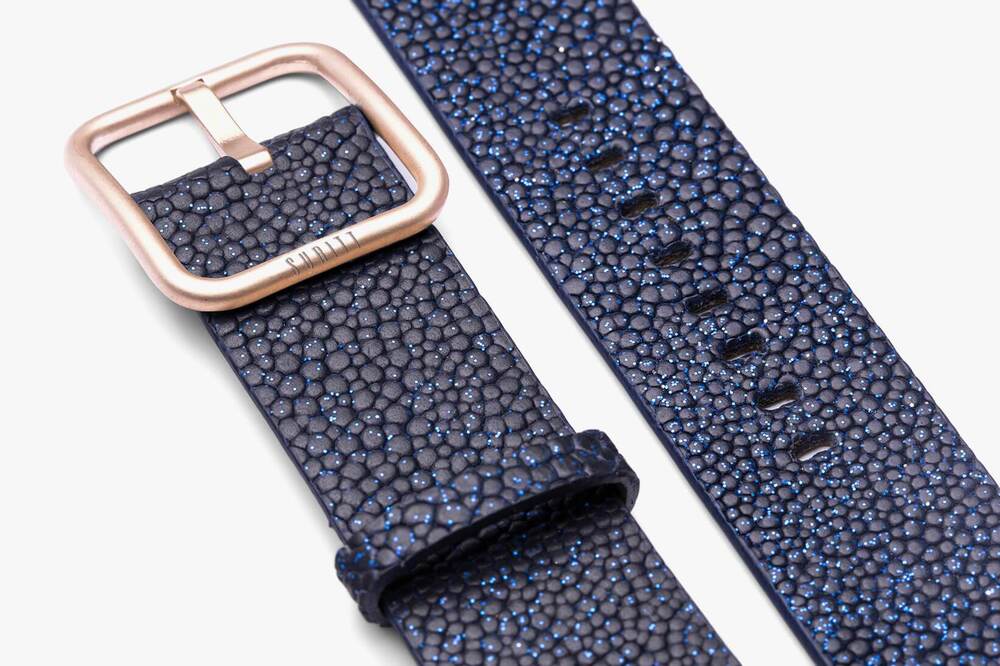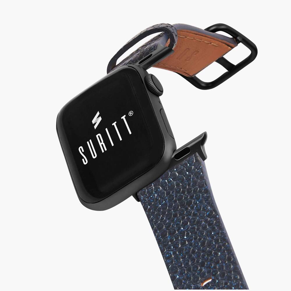 De New Wonder Midnight Blue Apple-horlogeband, handgemaakt met 100% natuurlijk marineblauw rundleer en textuur met glitter. De SURITT Wonder Midnight Blue-horlogeband heeft een bruine lederen voering.