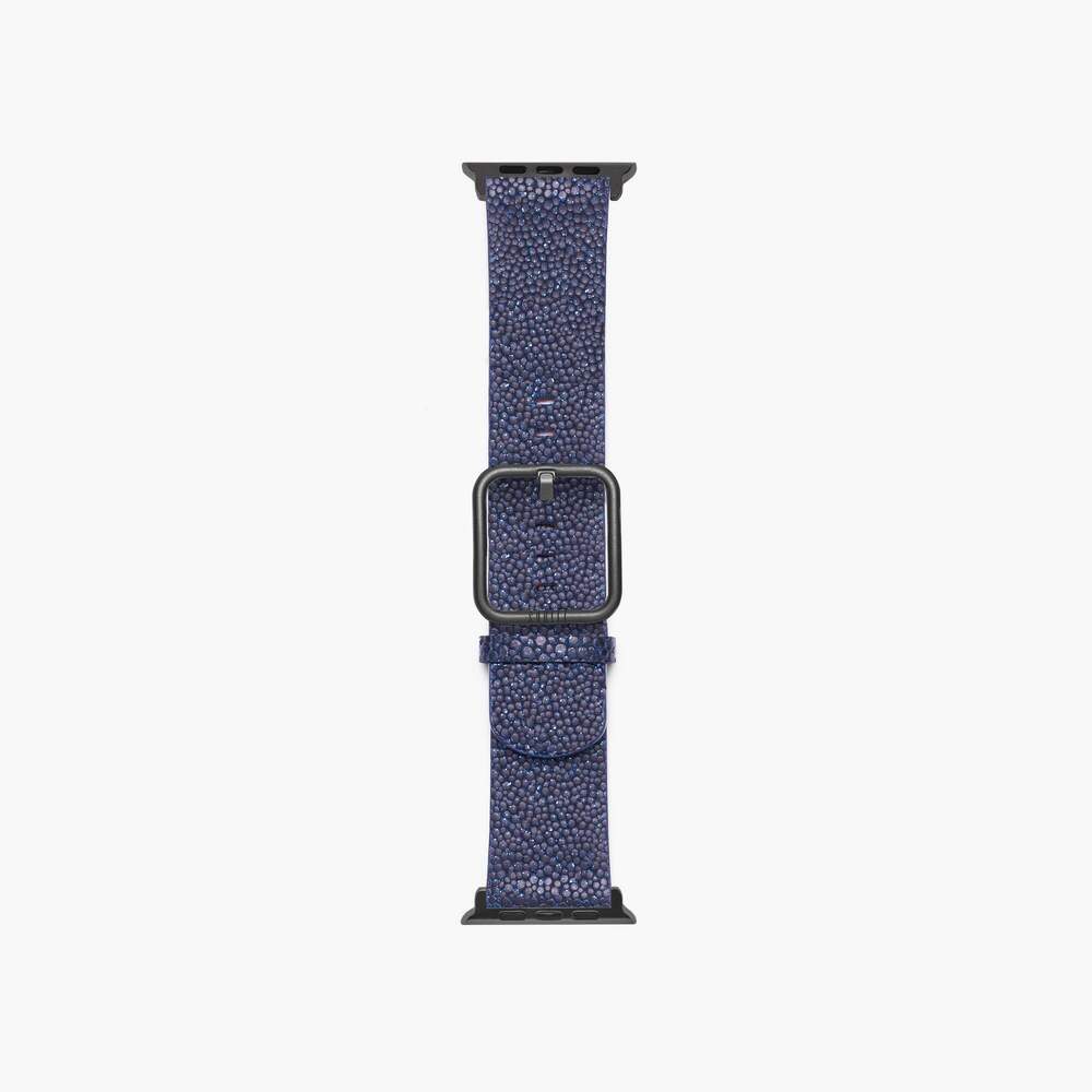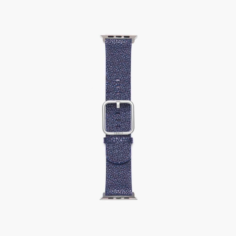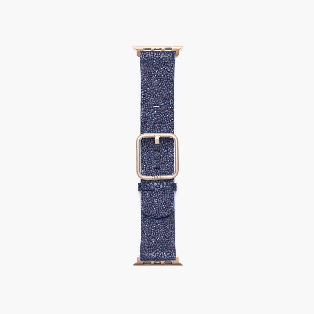 De New Wonder Midnight Blue Apple-horlogeband, handgemaakt met 100% natuurlijk marineblauw rundleer en textuur met glitter. De SURITT Wonder Midnight Blue-horlogeband heeft een bruine lederen voering.