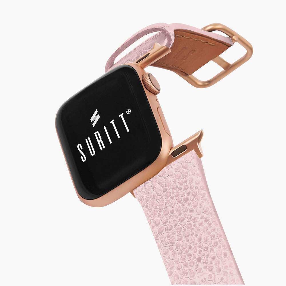 SURITT presenteert de New Wonder Soft Pink Apple Watch-band, handgemaakt in roze rundleer en afgewerkt met gegraveerde textuur en glitter. De SURITT New Wonder Soft Pink horlogeband heeft een lederen voering in bruine kleur.