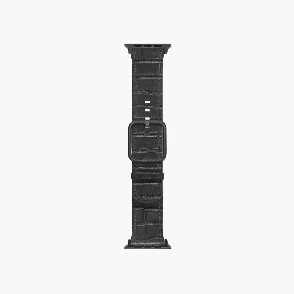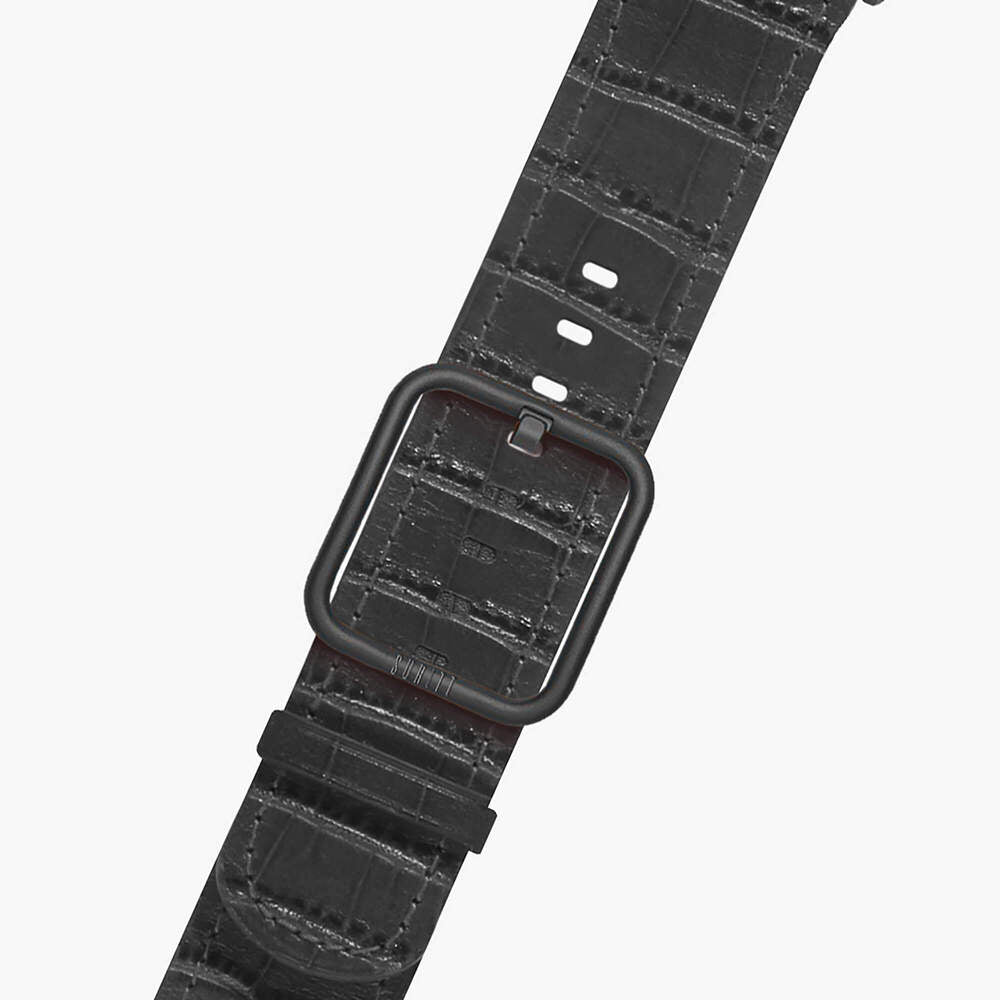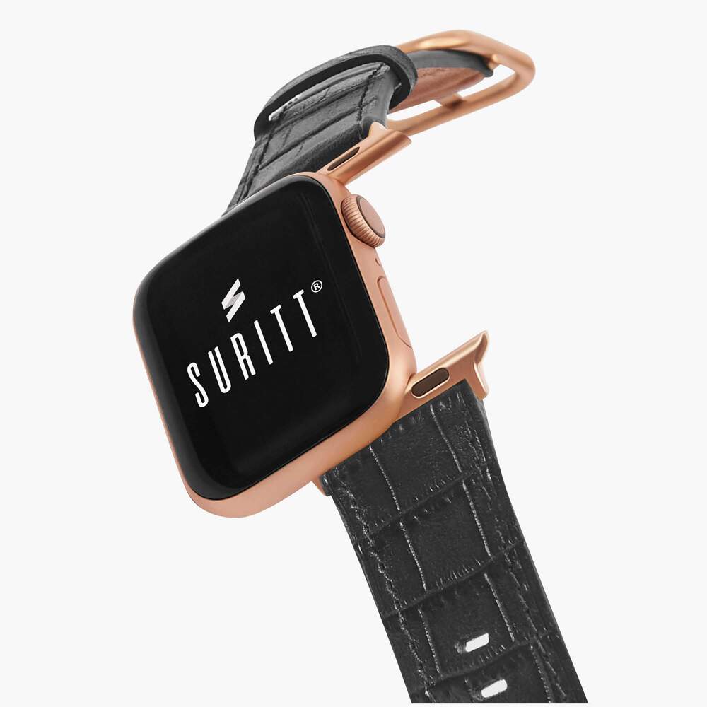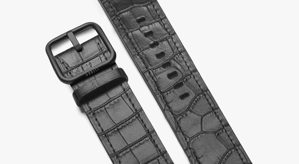 Een klassiek en minimalistisch ontwerp; de riem voor Apple Watch SIDNEY BLACK van SURITT, gemaakt van echt rundleer met zwarte krokodillenprint. Het heeft een 100% natuurlijke lederen voering in leerkleur en een waterdichte behandeling. Een exclusief ontwerp gemaakt met de beste materialen, één voor één geselecteerd in onze eigen winkel in Italië.