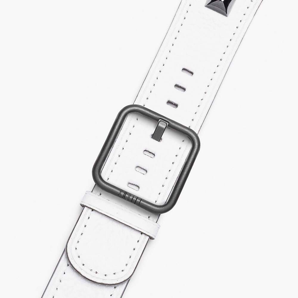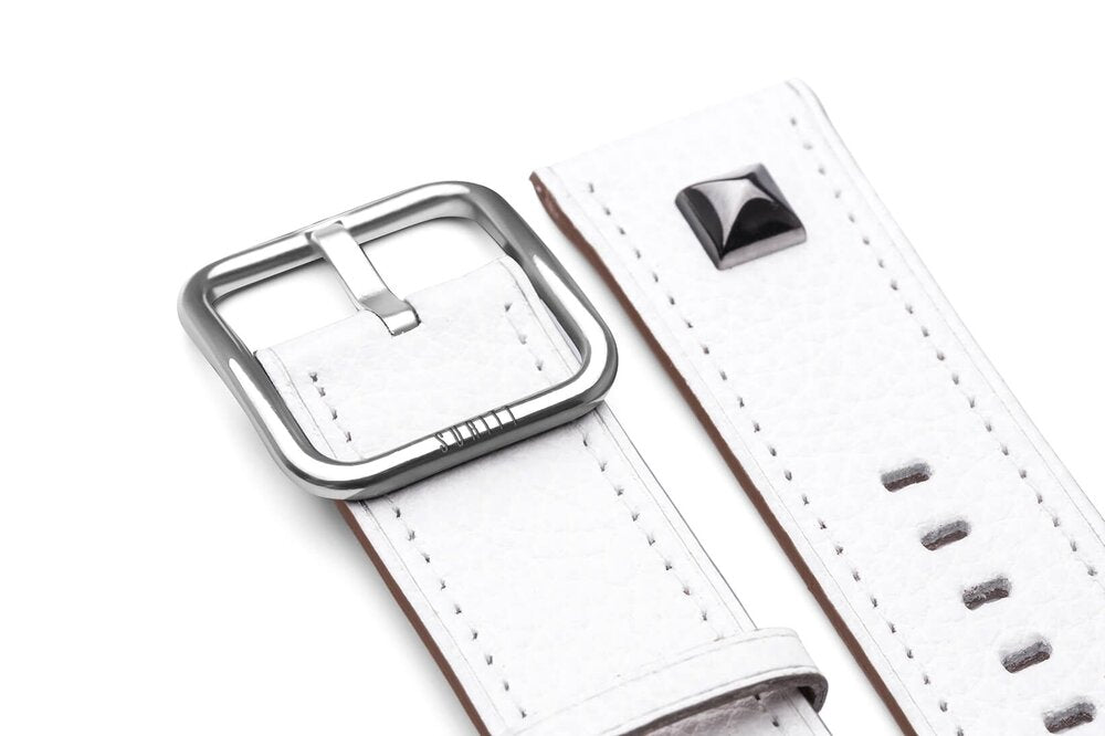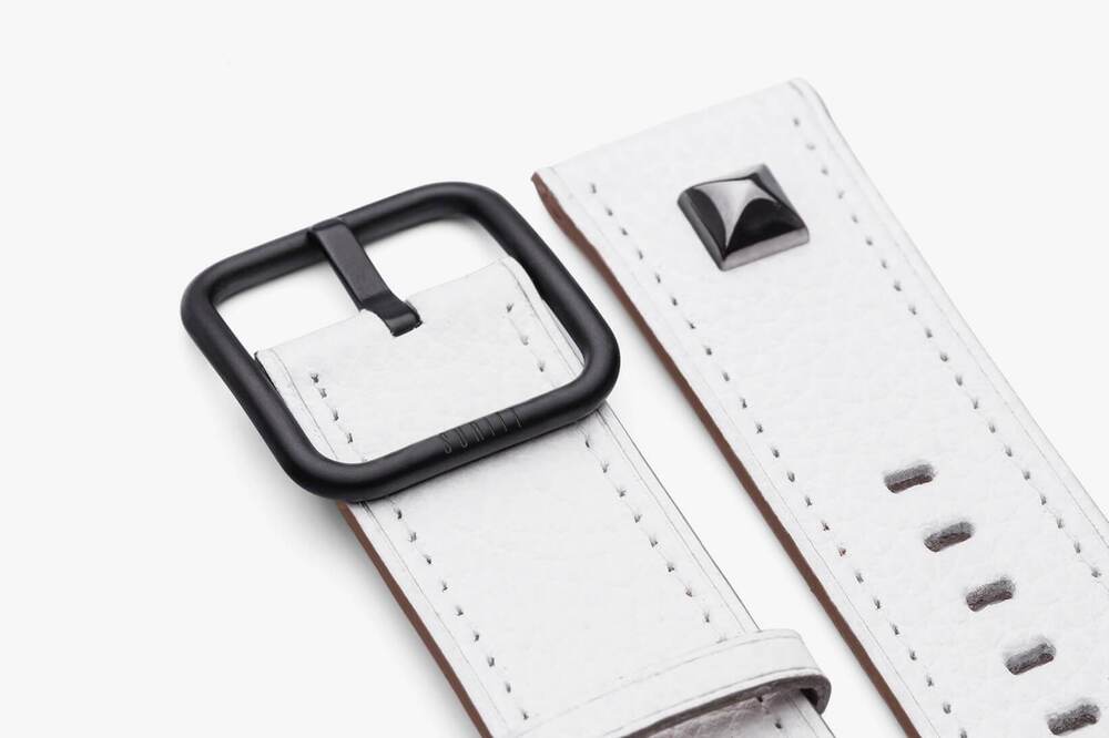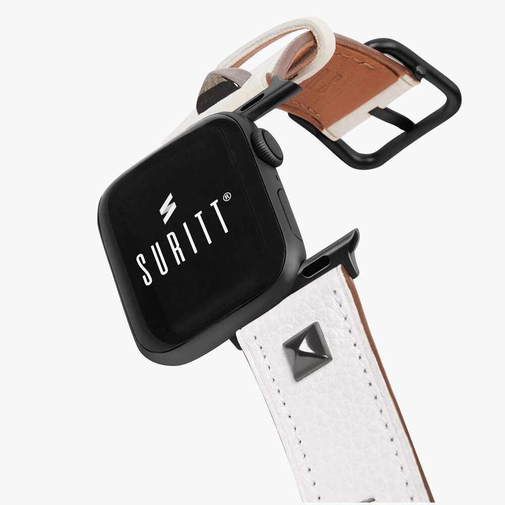 SURITT presenteert de Apple Watch horlogeband Oslo, het meest luxueuze en onderscheidende model van het merk. Ontworpen in wit gefreesd leer met bruine rand en een zwarte piramidevorm die het een unieke en luxueuze uitstraling geeft. De voering is tevens gemaakt van 100% natuurlijk rundleer.